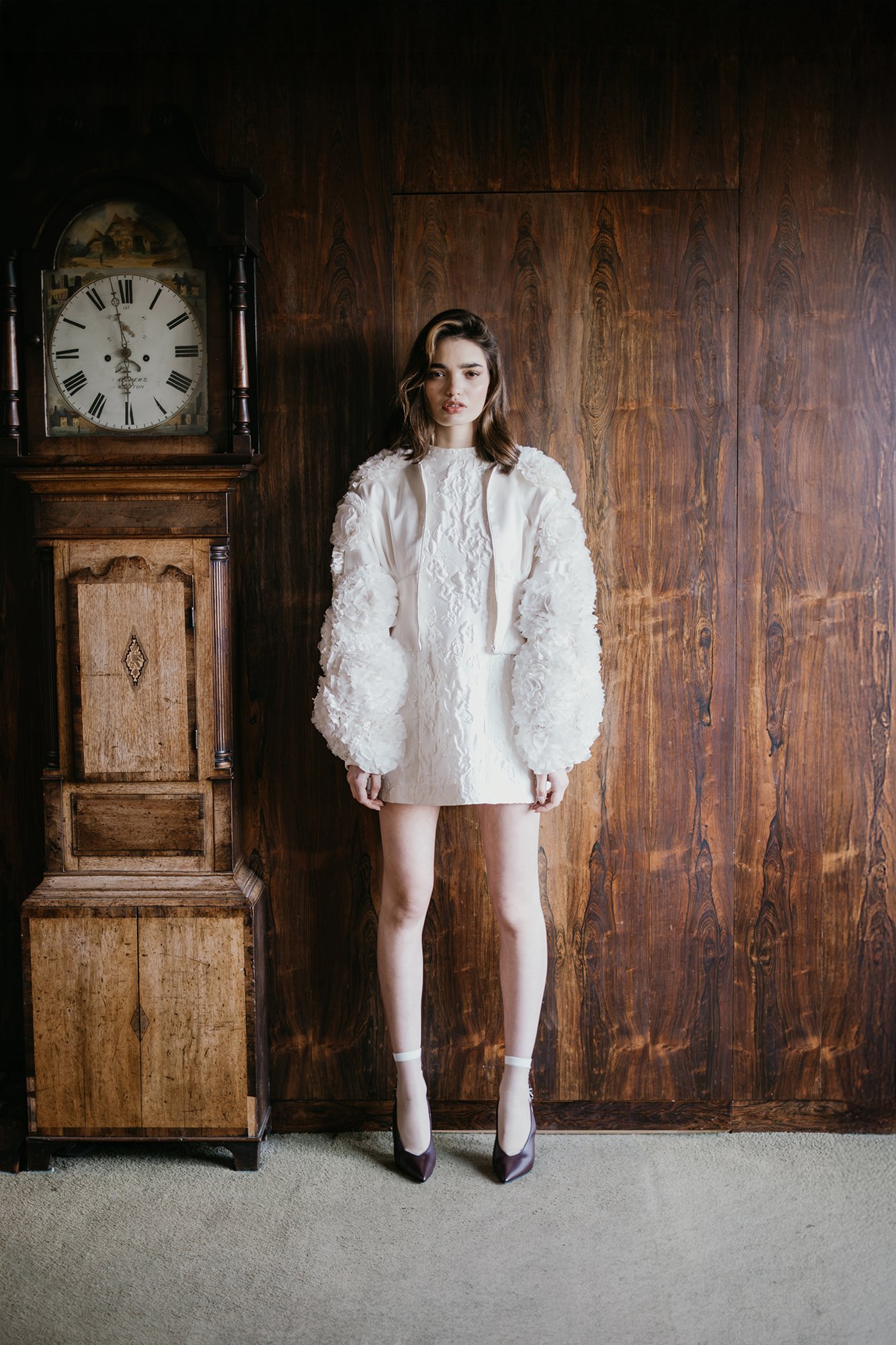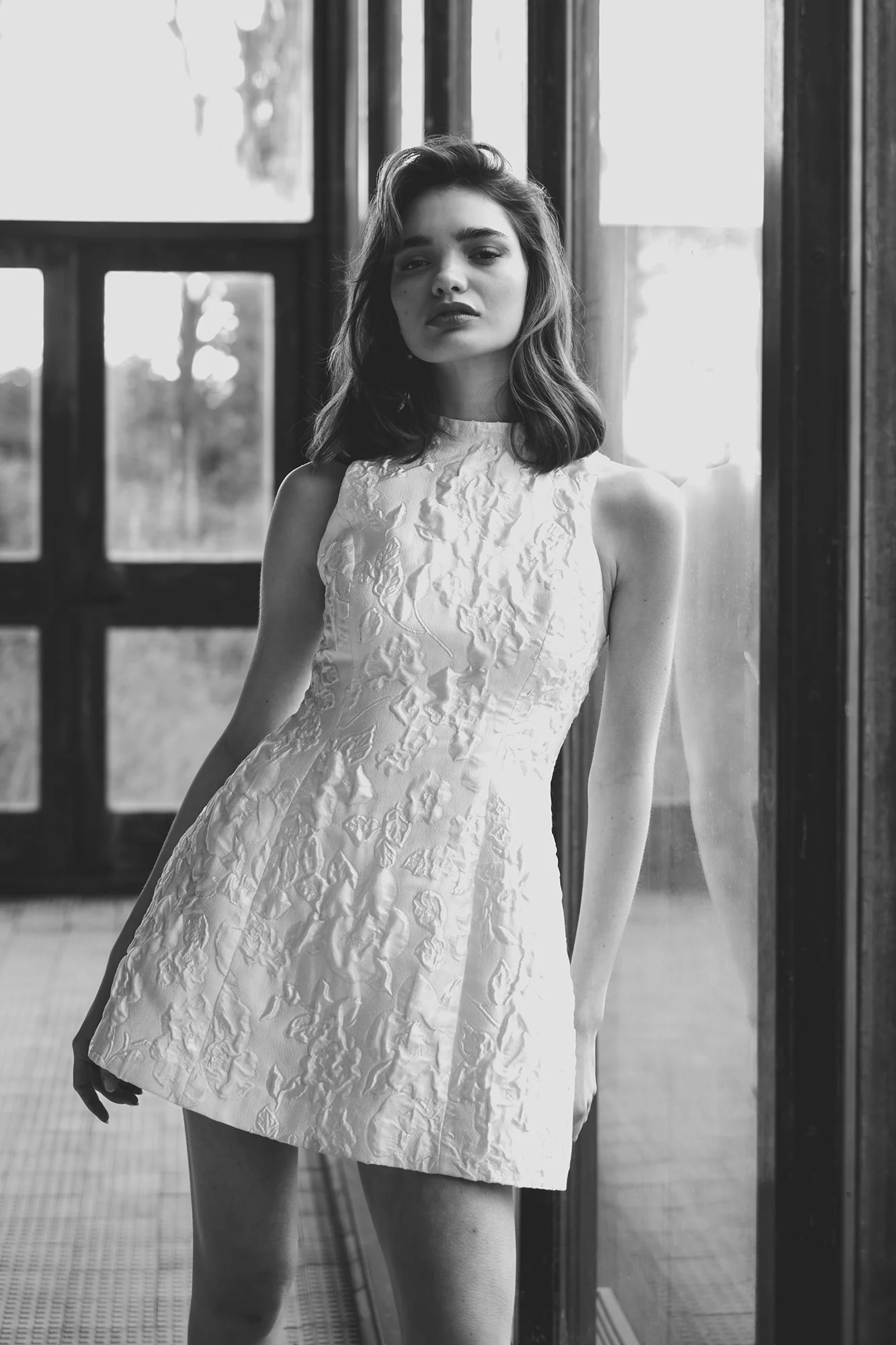 The CONNIE bridal mini dress is crafted from a textural satin jacquard with a contemporary 3D floral design. A modern high neckline and A-line skirt make this statement piece perfect for the non-traditional bride.