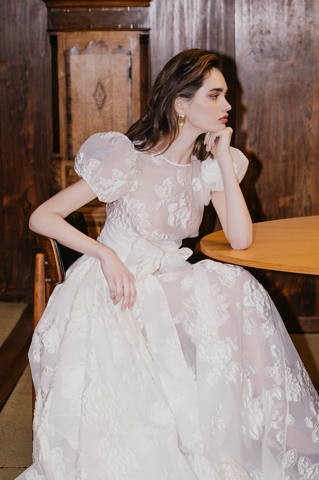 The HALLIE puff-sleeved top layers effortlessly over our collection of modern bridal gowns to transform and elevate. Crafted from a luxurious 3D floral jacquard; this bridal top feels both contemporary and romantic.