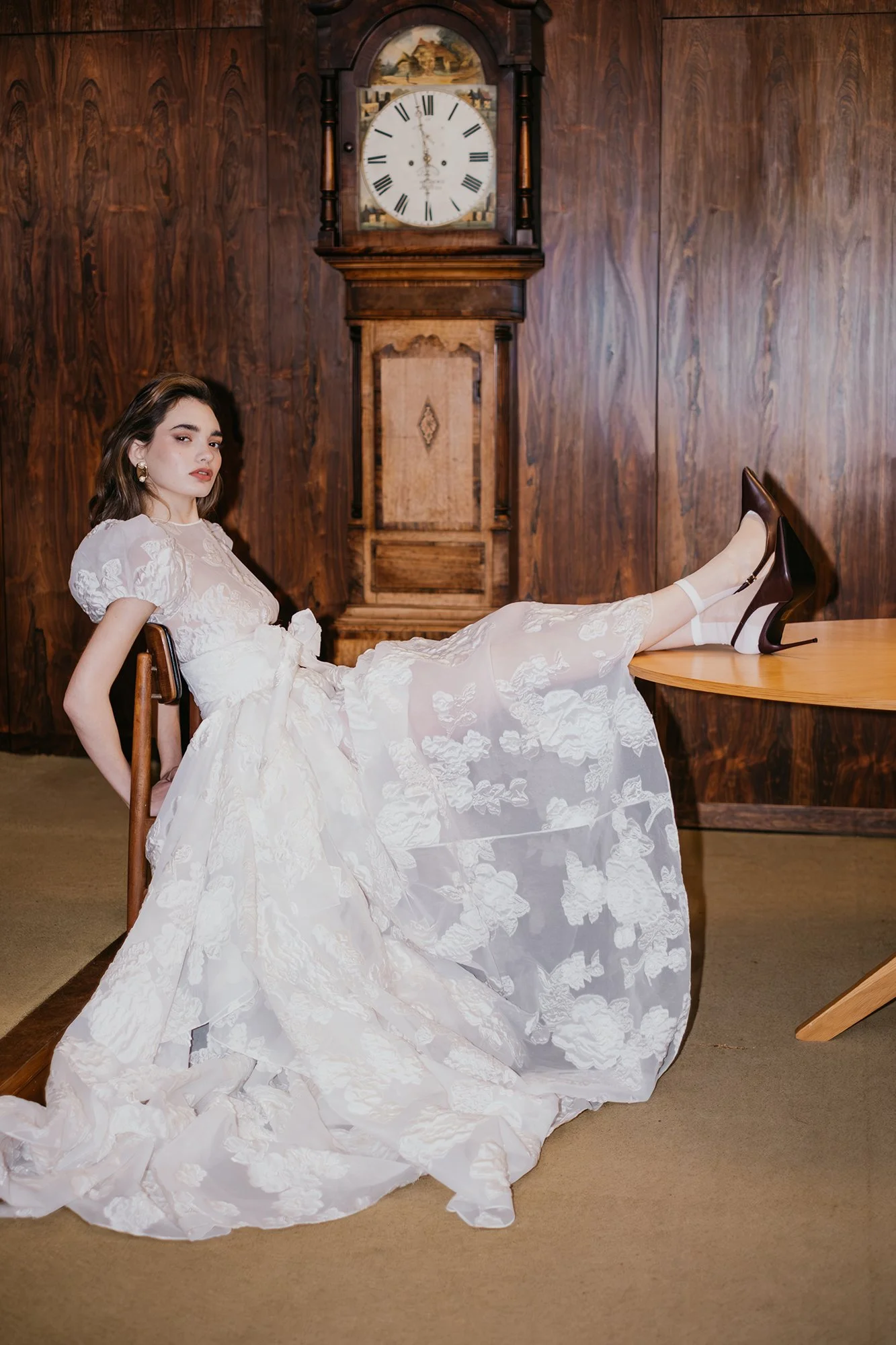 This statement bridal top, encompasses our signature waist defining bow and sculptural puff sleeves that feel contemporary rather than whimsical.
