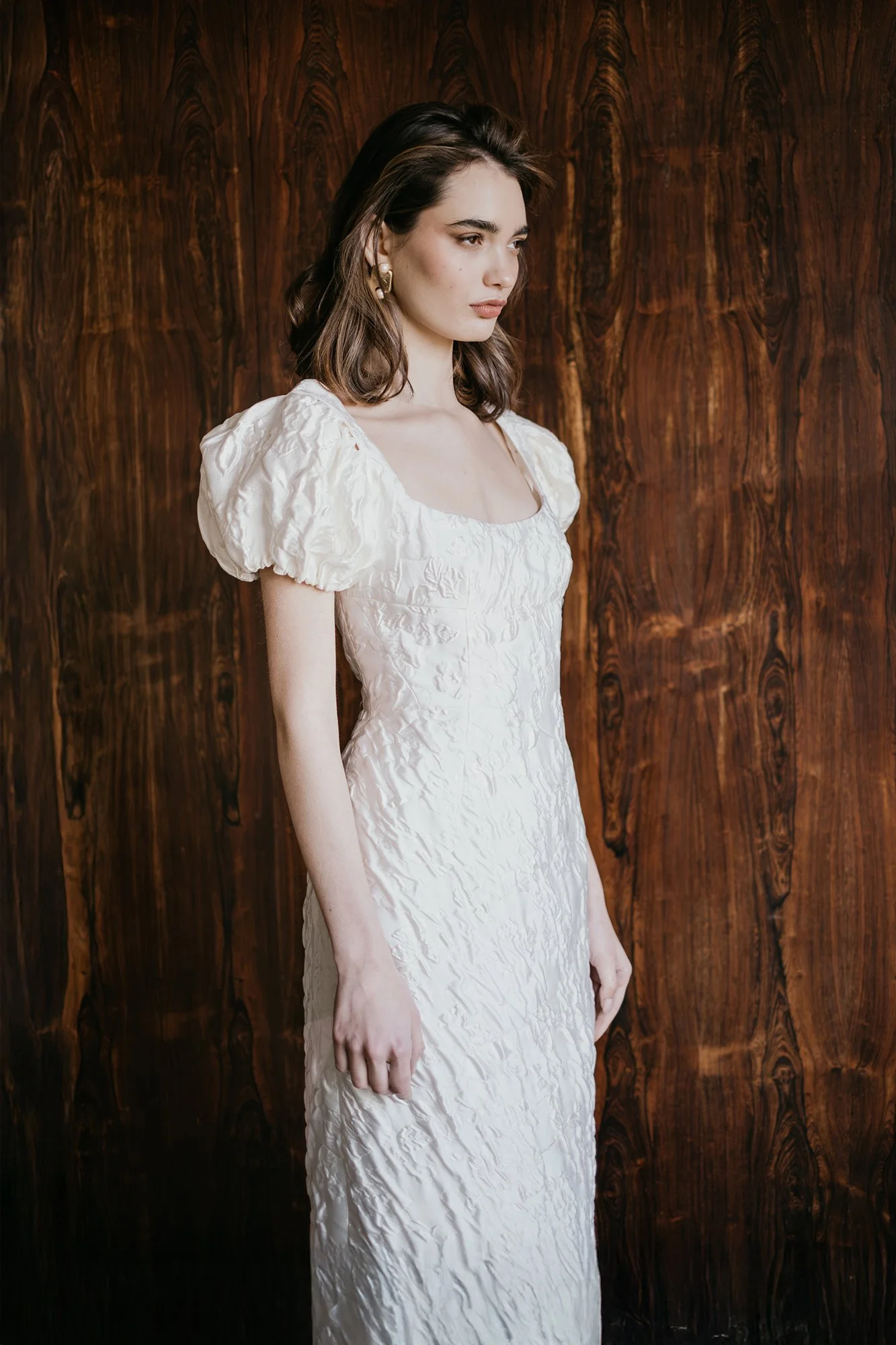 TEXTURED COLUMN BRIDAL GOWN WITH PUFF SLEEVES